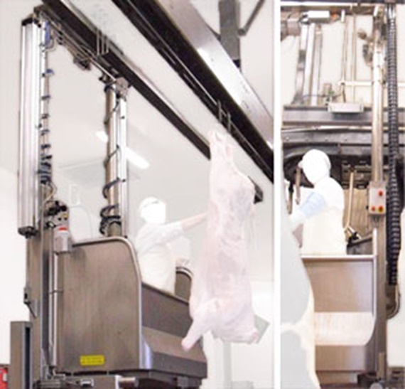 This meat processing plant in France uses lift platforms that enable employees to process meat vertically. Lifting and lowering the platform simplifies cutting and labeling the meat.