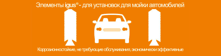 Элементы igus®, не требующие обслуживания и смазки, коррозионностойкие, изготовленные из высокоэффективных полимерных гибких кабель-каналов, гибких кабелей и подшипников скольжения, помогут увеличить срок службы вашей установки, уменьшая при этом затраты и удовлетворяя постоянно повышающиеся требования к современным моечным установкам.