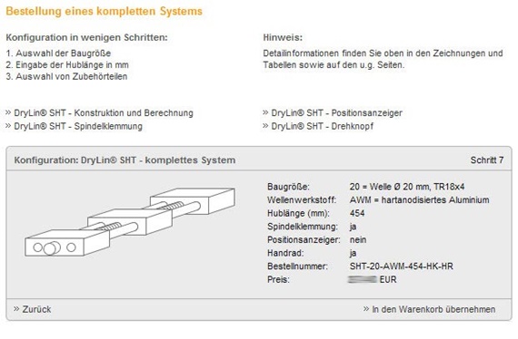 In order to design drylin® products for individual customer applications, the configurator is intended in the relevant product pages. drylin® T linear guides, drylin® N low profile linear guides, drylin® W guides and drylin® SHT spindle-lift tables can be configured. Individual length, potential clearance adjustments and optional accessories are defined at the same time according to requirements.